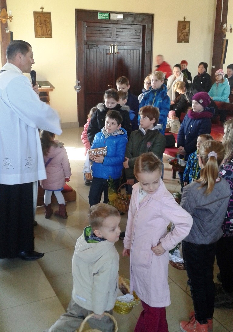 W Wielką Sobotę Ksiądz Proboszcz spotkał się z wiernymi, aby poświęcić pokarmy. Obok tradycyjnej „święconki” mogliśmy przypomnieć sobie, co oznaczają symbole wielkanocne znajdujące się w koszyczku. Święcenia zakończyliśmy modlitwą przy Grobie Pańskim, po czym wróciliśmy do domów aby dalej oczekiwać na Zmartwychwstanie Pana.